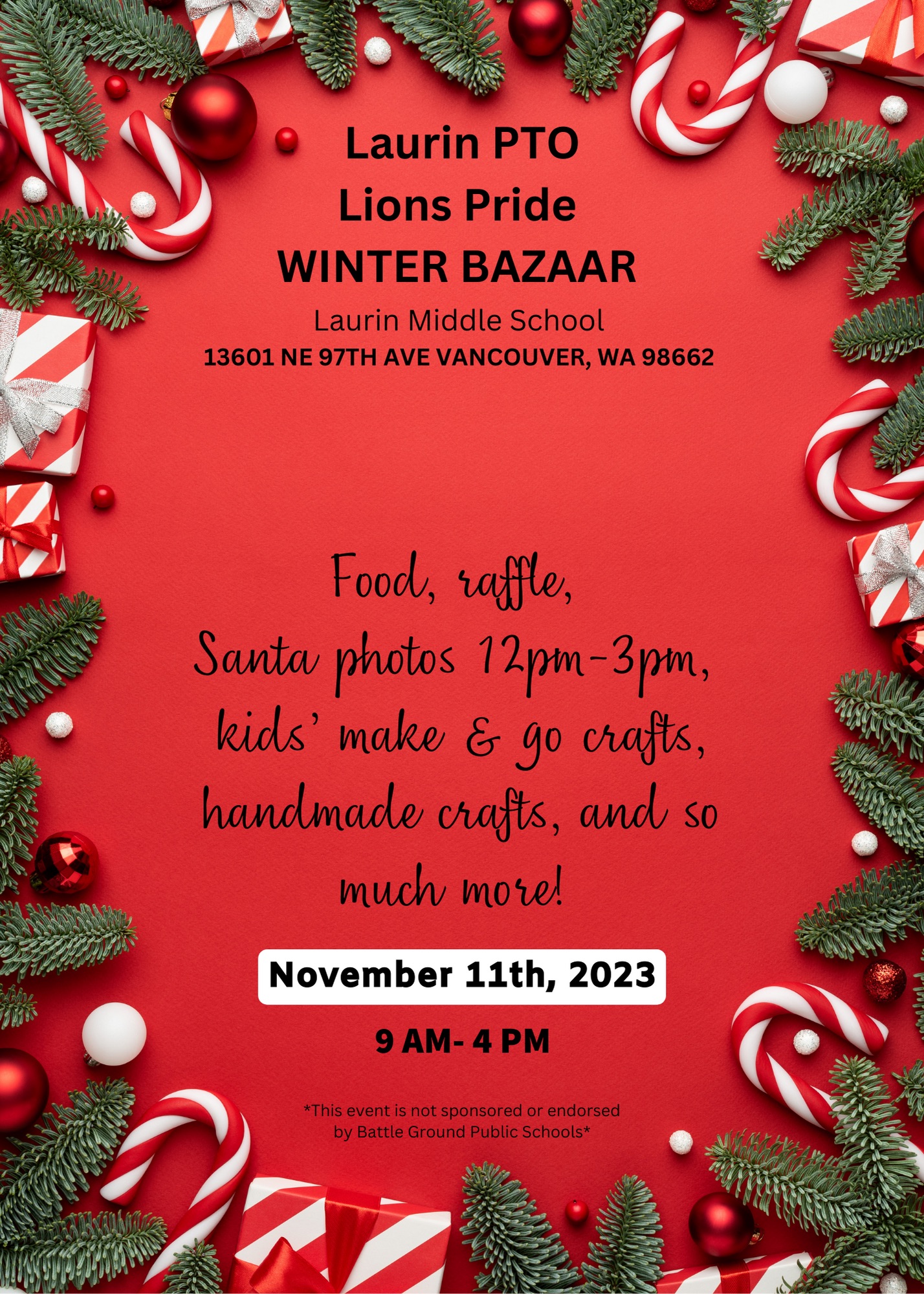 Come see all the wonderful vendors at Laurin Middle School.Santa Photos 12pm-3pmMiss. Washington Meet and Greet 1:30-3pmMany unique vendors and so much more!Related